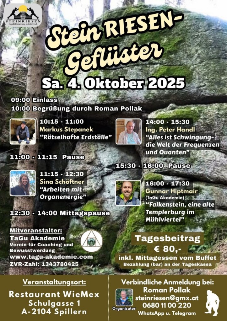 Roman Pollak / Steinriesen, veranstaltet gemeinsam mit der „TaGu Akademie“, dem Verein für Coaching und Bewusstwerdung, das SteinRIESENGeflüster, das 1. Weinviertler Forscher Symposium in Spillern bei Korneuburg.